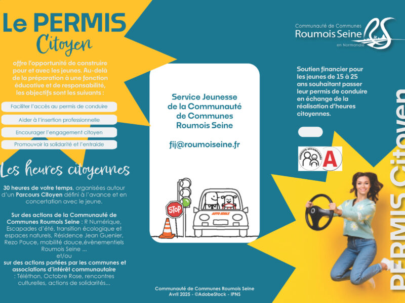 Financez votre Permis tout en agissant pour votre Communauté ! Vous avez entre 15 et 25 ans et résidez sur le territoire Roumois Seine ? Le programme PERMIS Citoyen est fait pour vous ! Il vous aide à financer votre [...] Financez votre Permis tout en agissant pour votre Communauté !