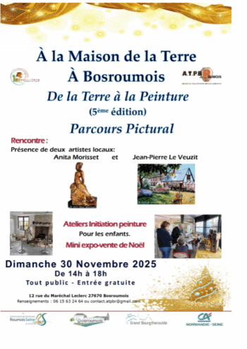 Prochainement A la Maison de la Terre à Bosroumois De la Terre à la Peinture (5ème édition) Parcours Pictural Rencontre : Présence de deux artistes locaux : ... Bosroumois Maison de la Terre à Bosroumois : De la Terre à la Peinture dimanche 30/11