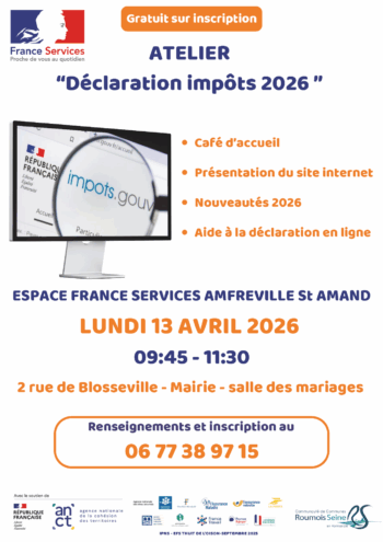 Prochainement ATELIER “Déclaration impôts 2026 ” LUNDI 13 AVRIL 2026 09:45 - 11:30 ESPACE FRANCE SERVICES AMFREVILLE ... ATELIER “Déclaration impôts 2026 ” lundi 13/04