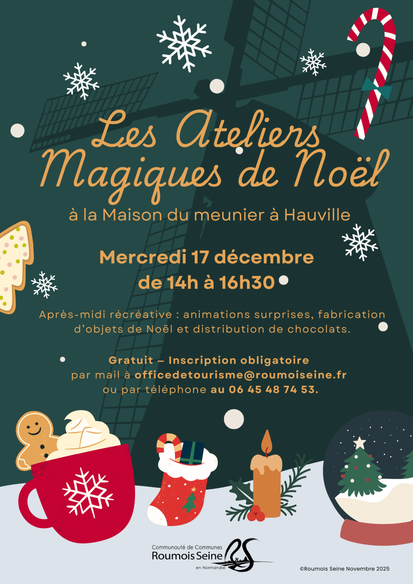 C’est un rendez-vous à ne pas manquer sur le territoire Roumois Seine pour célébrer la fête la plus féerique de l’année ✨ : le 17 décembre de 14h à 16h30, retrouvez-nous à la Maison du Meunier à Hauville !