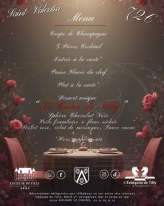 Un menu à la carte pour l’entrée et le plat, avec des entre-temps et un dessert unique, confectionné par notre chef spécialement pour l’occasion, sur le thème de l’amour. Nous proposons ce menu à 72€, et il sera exclusif le soir du 14 février 2026 au Château de Tilly.