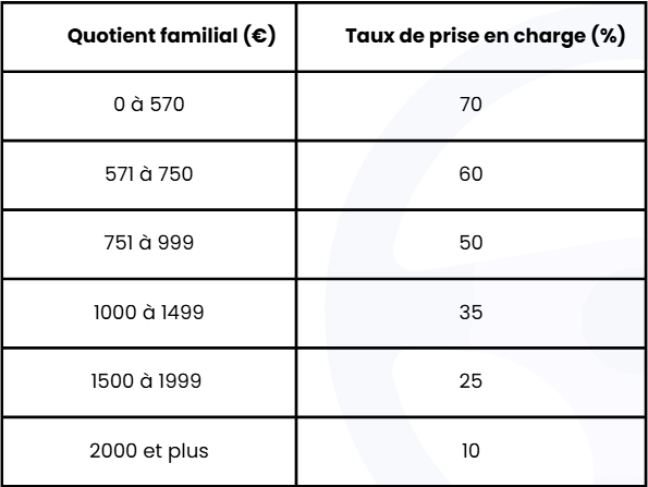 - Taux de prise en charge : 70 % du montant du devis (Quotient familial de 0 à 570€)